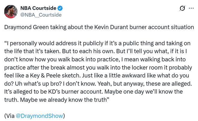 “所以如果是我,我会公开回应。但每个人处理方式不一样。不过说实话,如果真是他的小号,全明星假期后回去训练、走进更衣室,那场面估计会超级尴尬,气氛都不对了。当然,这些目前都只是传闻,只是说这个小号疑似属于杜兰特。也许有一天我们会知道真相,也许我们其实已经知道了,谁知道呢。”