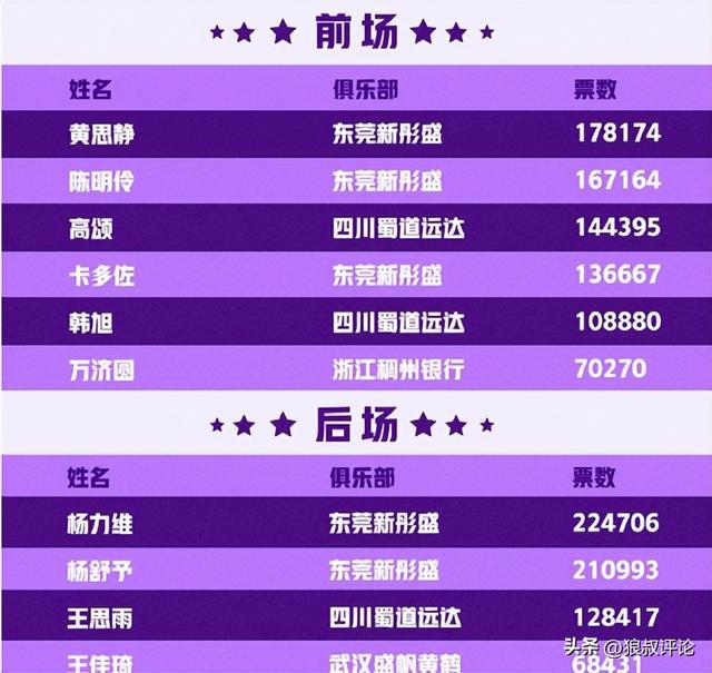 南区首发球员为:杨力维、杨舒予、黄思静、陈明伶(东莞新彤盛)、高颂(四川蜀道远达),杨力维以224706票成功当选票王。