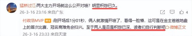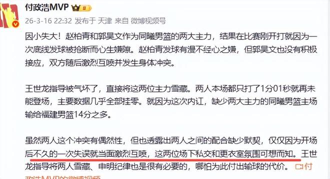 球迷说,比赛刚刚开始,就是丢了两分也不是什么大事,后面可以打回来,何必爆发内讧?那么为何赵柏青和郭昊文如此不相待,险些大打出手呢?这不仅仅是表面上的发球失误,媒体人付政浩发文说出深层次原因,那就是队内竞争激烈,或早已积怨不浅。付政浩表示,“这场失利不仅暴露了两位主力球员之间的不和睦,而且难免会让冠名商颇为败兴。更重要的是,这一个细节也暴露出同曦更衣室的微妙氛围。”