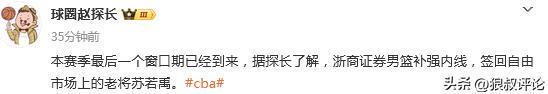 “球圈赵探长”发文:本赛季最后一个窗口期已经到来,据探长了解,浙商证券男篮补强内线,签回自由市场上的老将苏若禹。