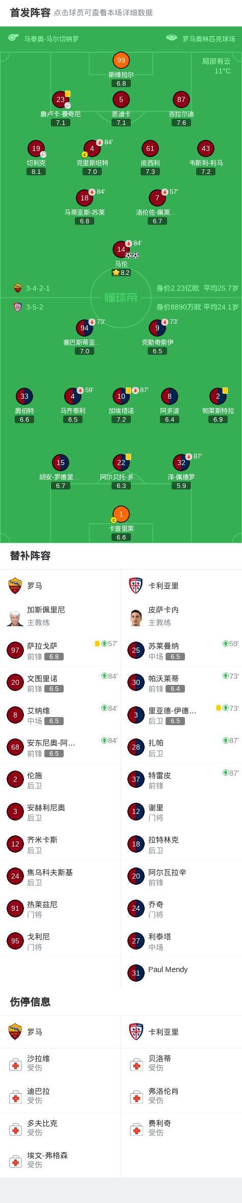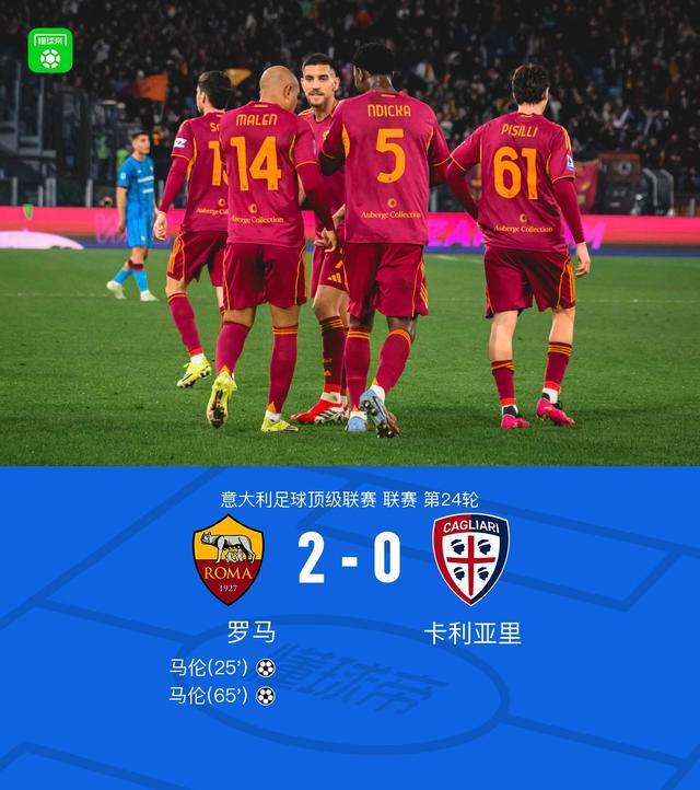 北京时间2月10日意大利足球顶级联赛第24轮,罗马主场对阵卡利亚里。比赛中,罗马球员先后通过两次团队配合,由马伦完成进球,最终罗马以2-0战胜卡利亚里。