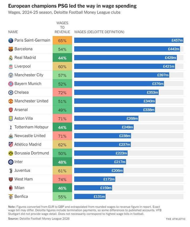 根据德勤财报的数字显示,巴萨在2024-25赛季的人员总成本是5.15亿欧元(4.42亿英镑)。所以巴萨想要满足工资帽要求,就需要填补这一块的空白。