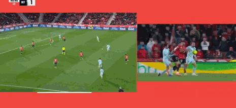 第45+2分钟,安东尼助攻,巴坎布小角度劲射破门,贝蒂斯2-0
