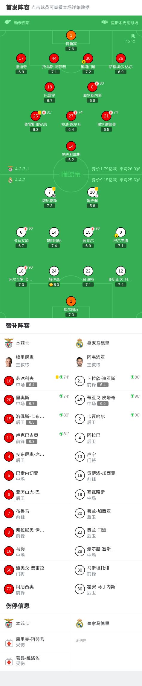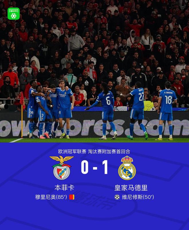 北京时间2月18日欧洲冠军联赛 淘汰赛附加赛首回合,本菲卡对阵皇家马德里。上半场,两队均无建树。下半场,维尼修斯轰入世界波。不过进球后他和对手产生口角,随后投诉自己遭遇种族歧视,比赛一度中断。比赛恢复后,穆里尼奥不满主裁判罚被红牌罚下。全场比赛结束,皇马1-0击败本菲卡。