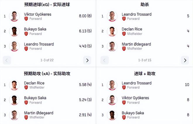 同时在英超赛场,进球+助攻数据大于等于5球球员,已经超过10人。阵容足够厚实,好球员够多,成为了阿尔特塔的底气。