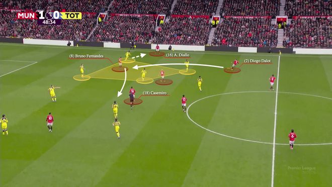 在2-0击败热刺的比赛里,B费的跑位迷惑了热刺左后卫德斯蒂尼·乌多吉,随后传给卡塞米罗,「胖虎」与姆贝莫配合未果,B费又率先做出反应,第一时间传中给左侧的卢克·肖,后者助攻阿马德·迪亚洛得分,可惜因为越位被判无效。