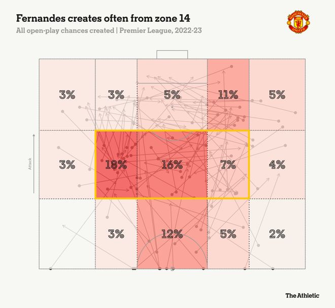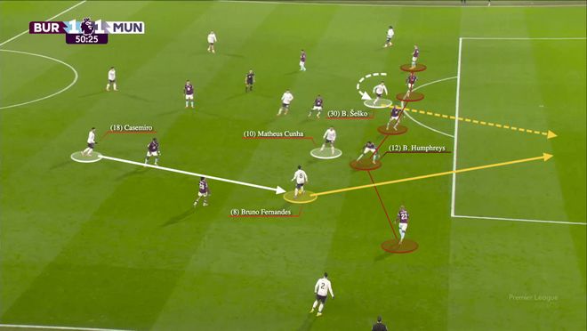 在这一区域的直塞球,他仅次于阿森纳的马丁·厄德高排名第二,同时,只有利物浦的萨拉赫在这个区域创造了更多的绝佳机会。B费就在这个位置斜传谢什科,帮助曼联1-0领先伯恩利。