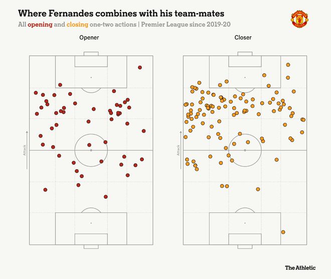 2019年8月以来,只有利物浦的安迪·罗伯逊和曼城的贝尔纳多·席尔瓦进行的二过一配合次数比B费多。与B费默契最好的,是过去的拉什福德,以及如今的边后卫卢克·肖和迪奥古·达洛。