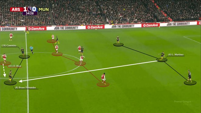 曼联的主要套路还是二打二的配合,像3-2击败阿森纳之战,B费和多古就这样突破中路,攻入了球队的第二球。