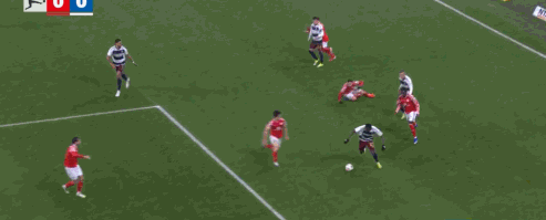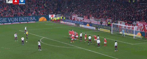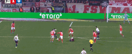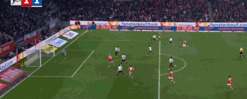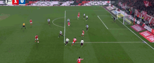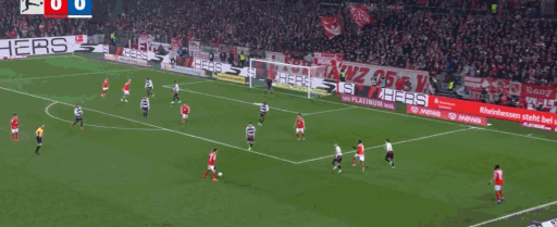 第45分钟,达科斯塔传中,阿米里凌空扫射破门,美因茨1-0