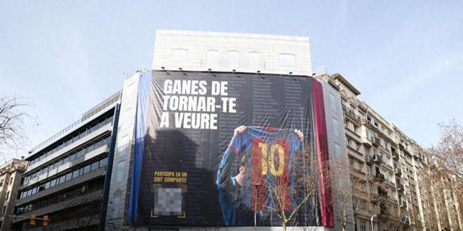 本周三上午,工作人员在格拉西亚大道与阿里包街交界处的建筑外墙上悬挂了一幅巨型横幅,上面是梅西在伯纳乌球场向皇马看台展示巴萨球衣的经典照片。横幅配文写道:"我们想再次见到你",这明显是在呼应2021年拉波尔塔竞选期间在伯纳乌附近悬挂的类似横幅。