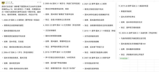 6、21-22赛季,这就比较狡诈了,人家不说明显错误的点球了,人家说的是越位。但你至少查一下比分吧,一场1比0,一场1比1,到你这儿说两球都有越位。咋地,都灵的也越位了呗?在这说,你咋说的是都灵在禁区内两次犯规不判点。回头我要批评豆包了,你这,胡说什么呢?打国米的比赛,禁区内不判点的都叫正常接触,不能叫犯规。