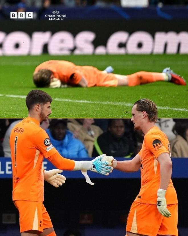 比赛第 17 分钟,在 0-3 落后的绝境下,热刺主帅图多尔做出了欧冠赛场闻所未闻的决定 —— 直接将首发门将金斯基换下,派上主力一门维卡里奥救火,可即便如此,热刺依旧再丢一球,上半场便已 0-4 落后。