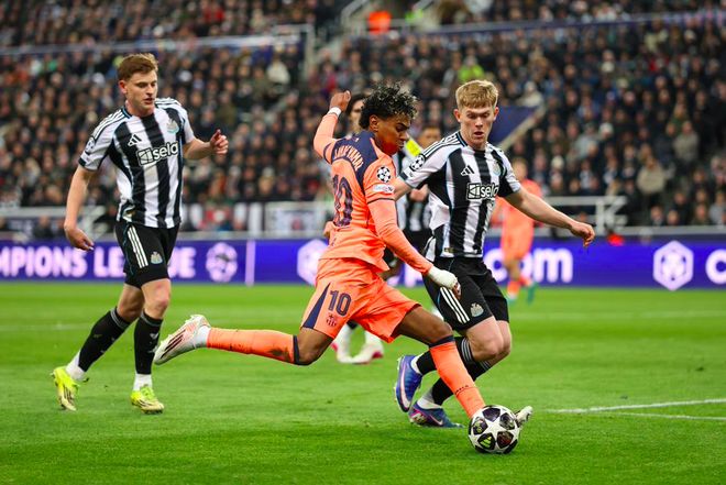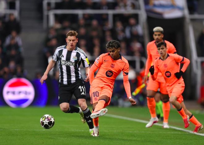 第15分钟,顶住了纽卡斯尔的三板斧,莱万多夫斯基平抽传球,亚马尔看到自己越位后主动跑到中路,拉菲尼亚似传似射,皮球被霍尔挡出。