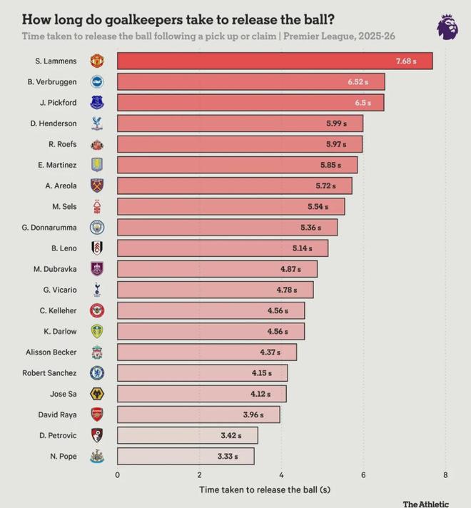 The Athletic统计,本赛季英超比赛中,只有波普和佩特洛维奇两名门将在拿球后发球的速度快于拉亚。