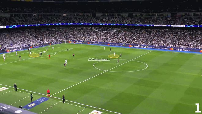 下面这个来自2023-24赛季四分之一决赛对阵曼城的例子中,皇马从门将安德烈-卢宁出球,到维尼修斯送出直传让罗德里戈形成单刀,仅用了数秒。这是球队风格与球员素质相结合、达到预期效果的完美例证。