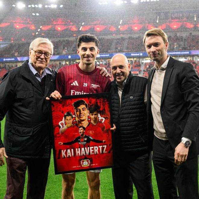 在赛前的仪式上,勒沃库森向哈弗茨赠送了特别纪念画板,比赛结束后,勒沃库森官方晒出了他们的合照,并配文:“在勒沃库森效力了10年,欢迎回来,凯。”