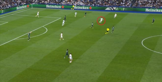 而在第17分钟,皇马则通过门前找到了边路的巴尔韦德,后者回敲之后,继续从罗德里和贝尔纳多-席尔瓦身侧完成了横移: