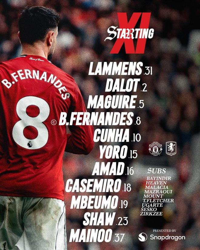 曼联首发:31-拉门斯、2-达洛特、5-马奎尔、8-布鲁诺-费尔南德斯、10-库尼亚、15-约罗、16-阿马德-迪亚洛、18-卡塞米罗、19-姆伯莫、23-卢克-肖、37-梅努