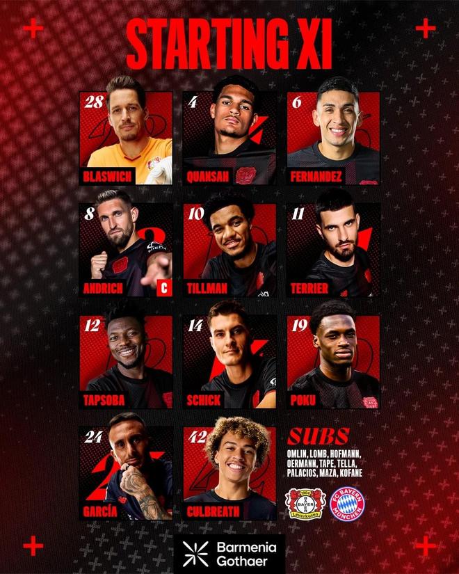勒沃库森vs拜仁:希克、夸安萨首发,基米希、路易斯-迪亚斯出战