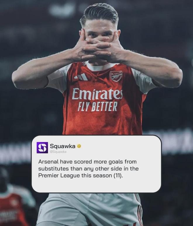 Squawka统计,阿森纳本赛季在英超已经通过替补登场的球员打进11球,分别是:哲凯赖什3球,梅里诺2球,热苏斯2球,马丁内利,萨卡,特罗萨德和道曼各1球。