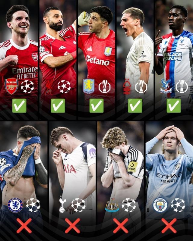 (欧冠)阿森纳、利物浦(欧联)维拉、诺丁汉森林(欧协联)水晶宫