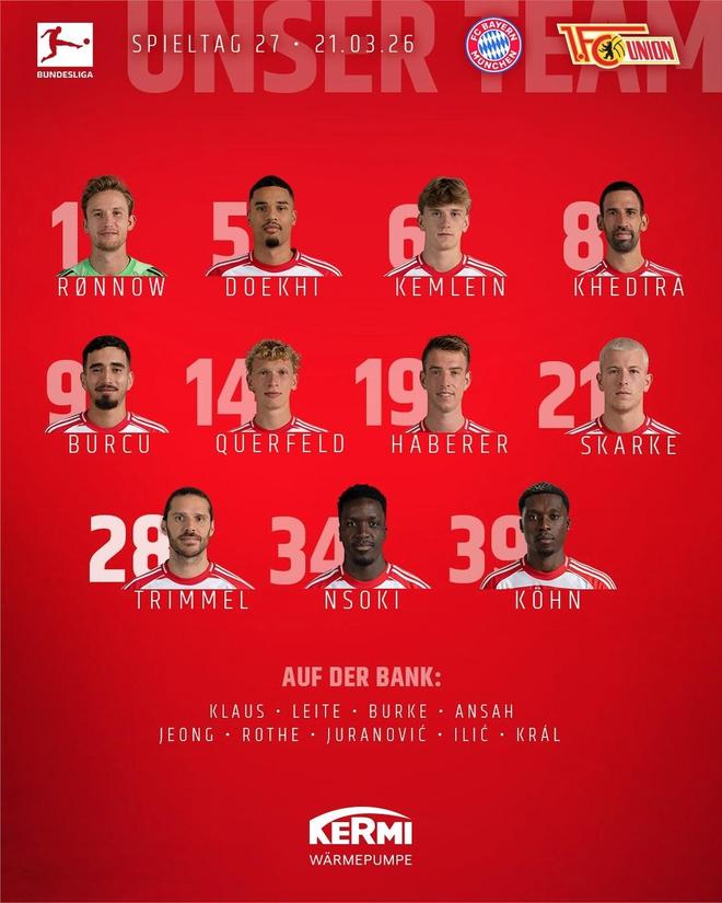 北京时间3月21日22:30,德甲联赛第27轮继续进行,拜仁慕尼黑坐镇主场迎战柏林联合。赛前双方首发阵容陆续公布: