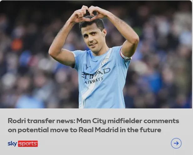 罗德里在接受Onda Cero采访时表示,他不会拒绝皇马的邀请,西班牙人暗示他有意在未来重返西甲,而这名中场当下的合同2027年夏天到期。
