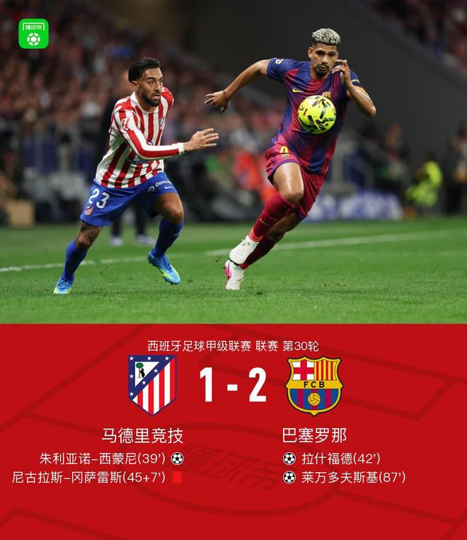 北京时间4月5日西班牙足球甲级联赛 联赛 第30轮,马德里竞技主场对阵巴塞罗那。马德里竞技朱利亚诺-西蒙尼破门。巴塞罗那拉什福德破门,莱万多夫斯基破门。最终比分马竞 1-2 巴萨。